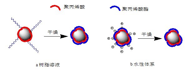 HT A20分子中的錨固部分由(甲基)丙烯酸、磷酸的均聚物或共聚物組成,通過和鈦白粉間的吸引力(配位作用、共價鍵)吸附在粒子表面,將粒子隔離開來。和樹脂相容的穩(wěn)定部分由丙烯酸酯、甲氧基聚丙二醇丙烯酸酯無規(guī)共聚物組成,賦予表面改性后的鈦白粉粒子良好的再分散性,并且能穩(wěn)定均勻分散在樹脂溶液和溶劑揮發(fā)后的樹脂中。在體系干燥過程中以及干燥后,和樹脂相容的部分能包覆在鈦白粉粒子表面,防止粒子聚集,使得鈦白粉粒子在樹脂中能均勻分散。圖2表示改性劑HT A20處理鈦白粉粒子后,HT A20在粒子表面的形態(tài)。圖2a表示在樹脂溶液或溶劑中,干燥前,改性劑的錨固部分和鈦白粉粒子間通過共價鍵、配位鍵結(jié)合在粒子表面上,聚丙烯酸酯部分充分伸展,通過空間位阻作用穩(wěn)定粒子;干燥后,聚丙烯酸酯部分包覆在粒子上或和樹脂基體互相滲透。圖2b表示在水性體系中,干燥前,改性劑的聚丙烯酸錨固部分和鈦白粉粒子間通過共價鍵、配位鍵結(jié)合在粒子表面上,依靠靜電斥力穩(wěn)定粒子;干燥后,聚丙烯酸酯部分包覆在粒子上或和樹脂互相滲透??梢?,雙親型嵌段聚合物改性劑HT A20對鈦白粉進(jìn)行有機表面處理后,在有機溶劑體系和水性體系中,都能提高鈦白粉在介質(zhì)中的分散穩(wěn)定性并改善鈦白粉和樹脂的相容性。